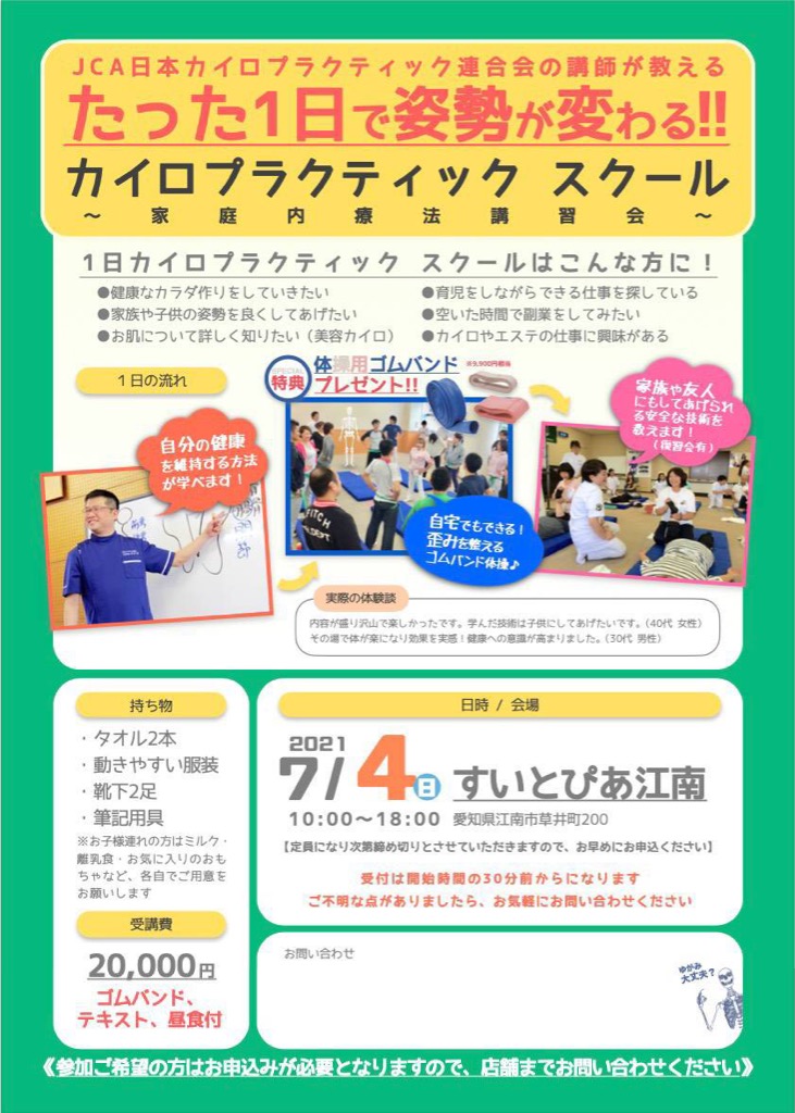 自己ケアの為、家族の健康の為にカイロプラクティック技術を覚えてみませんか?